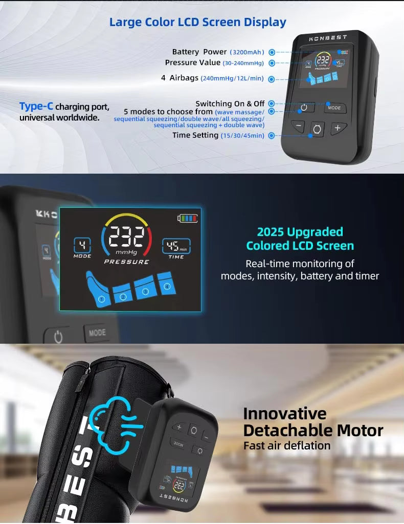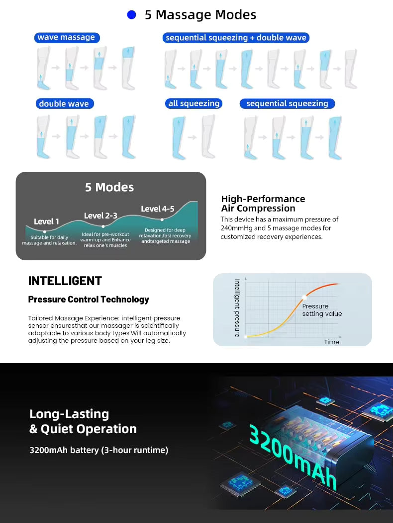 Ideal for sports recovery, circulation improvement, and home therapy, the air compression leg boots are a must-have for those seeking professional recovery at home.